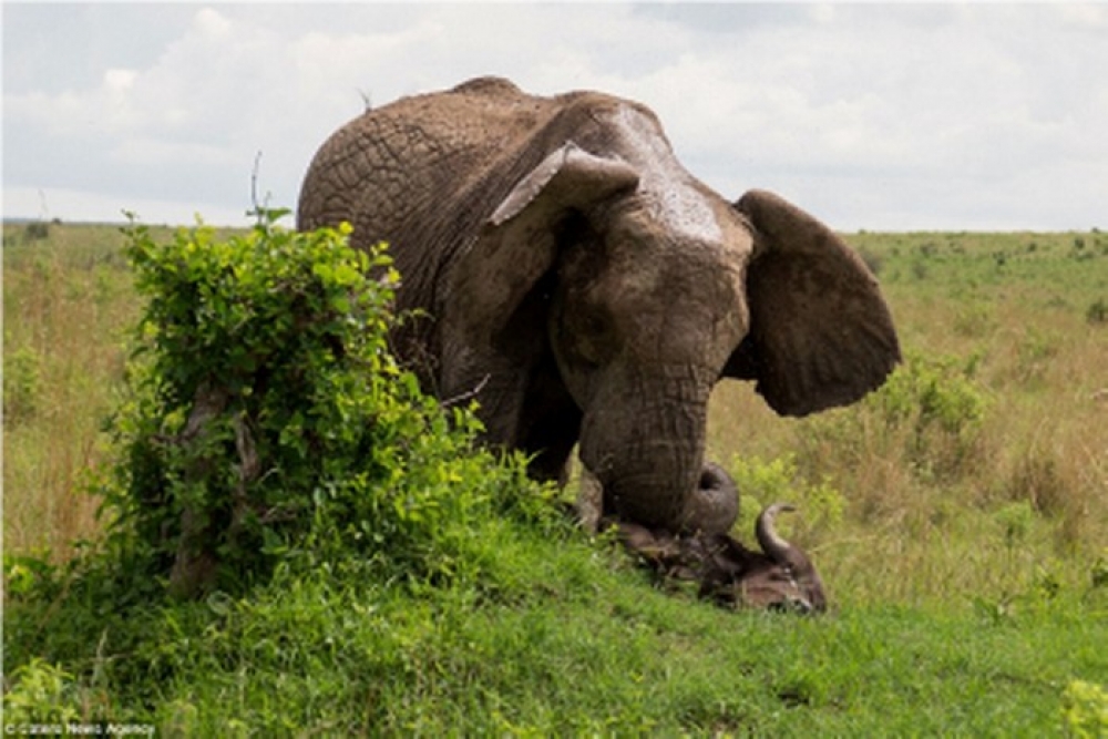 Kako se bivol postavio na slonicu, ona je odlučila opet napasti ga te je zarila kljove u njega i bacila ga visoko u zrak.