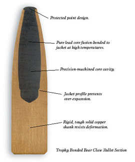 Trophy bonded razvijen je prije 60 ak godina za lov na medvjede i losa na području Aljaske. Razvio ga je Jack Carter za potrebe profesionalnih lovaca na grizlije koji su nerijetko bili u opasnosti da bježe od ranjenih zvijeri. Ovo zrno se proslavilo u prošlom stoljeću i popularnost mu ne pada. Sastoji se od dva dijela kojeg cine legura bakra s velikom šupljinom te olovnog dijela koji ispunjava tu šupljinu. Bakar i olovni dio spojeni su zagrijavanjem tako da kod udara u cilj ne dolazi do razdvajanja olova od bakra sto je kod prvih modela bilo cesto. Olovo mu ispunjava skoro dvije trećine sto ovom zrnu daje veliku udarnu moć. Zbog ovakvog dizajna prilikom udara u tijelo divljaci oblik gljive se stvara trenutno, a promjer gljive naraste i do dva puta veći od promjera zrna. Trenutno sirenje zrna stvar i veliki početni sok te pri udaru u kosti zrnu se ne deformira zadnji,bakreni dio. penetracija je velika u odnosu na klasična lovačka zrna ali i manja nego kod monolitnih.Svejedno zrno u pravilu ostavlja izlaznu ranu,dobar krvni trag te zadržava težinu između 92-98 %,rijetko manje od 90%.Idealan je za veliku divljač ali dobar je i prilikom odstrjela divljaci veličine srne jer ne razara meso.